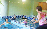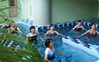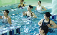 水の中でリズミカルに体を動かして運動量を心地よい範囲まで上げ、楽しみながら体力アップ。