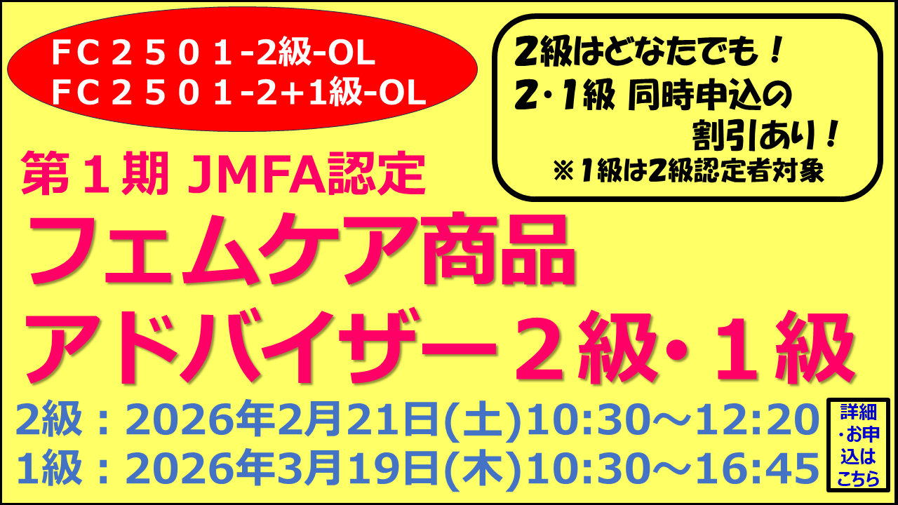 新資格!第1期 JMFA認定「フェムケア商品アドバイザー2級・1級」詳細・申込開始しました!