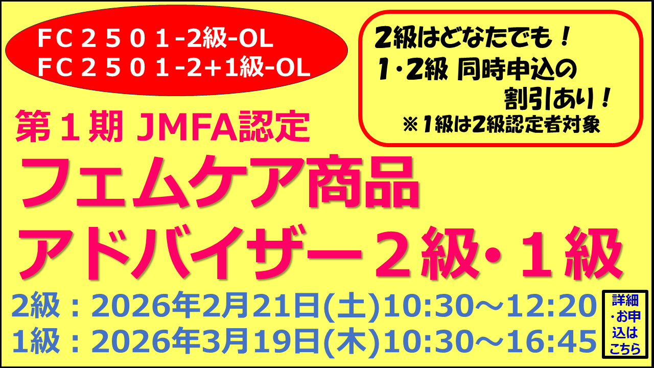 新資格!第1期 JMFA認定「フェムケア商品アドバイザー2級・1級」詳細・申込開始しました!